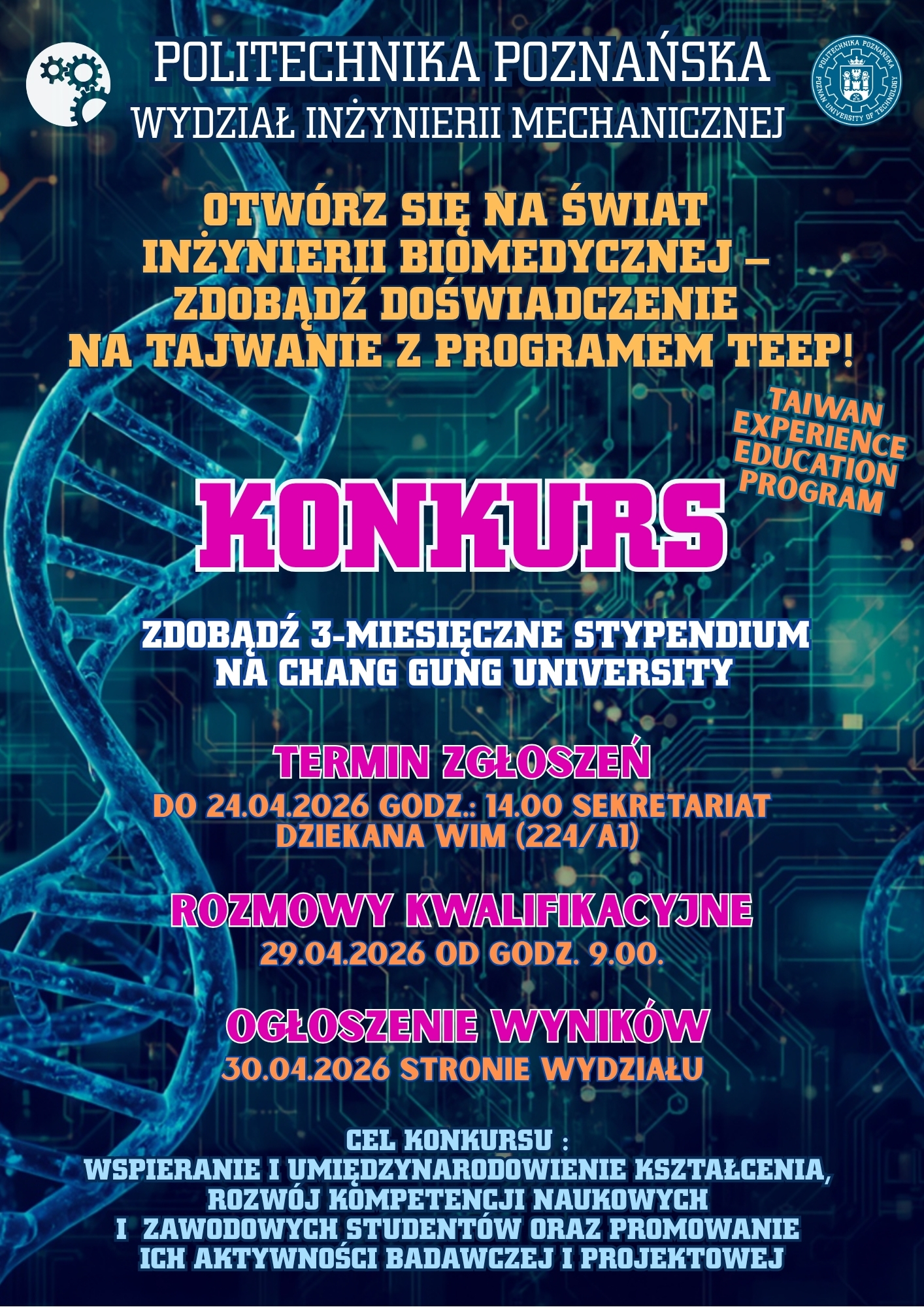 Wydział Inżynierii Mechanicznej Politechniki Poznańskiej ogłasza konkurs na wyjazd studencki w ramach programu praktyk TEEP realizowanego na Chang Gung University (Tajwan).