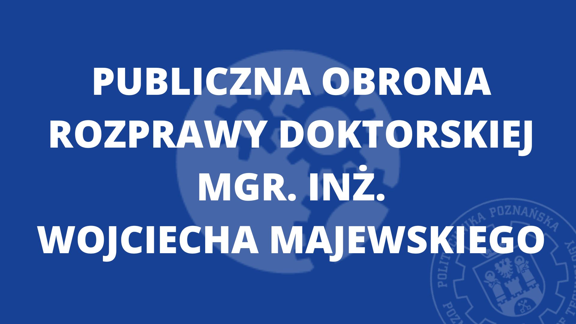 DZIEKAN  I  RADA DYSCYPLINY INŻYNIERII MECHANICZNEJ POLITECHNIKI  POZNAŃSKIEJ zawiadamiają o publicznej dyskusji nad rozprawą doktorską w dziedzinie nauk inżynieryjno- technicznych w dyscyplinie inżynieria mechaniczna mgr inż. Wojciecha MAJEWSKIEGO na temat: „Badanie i modelowanie procesów technologicznych opon na maszynach VMI MAXX  w celu uzyskania określonych wyników jednorodności”